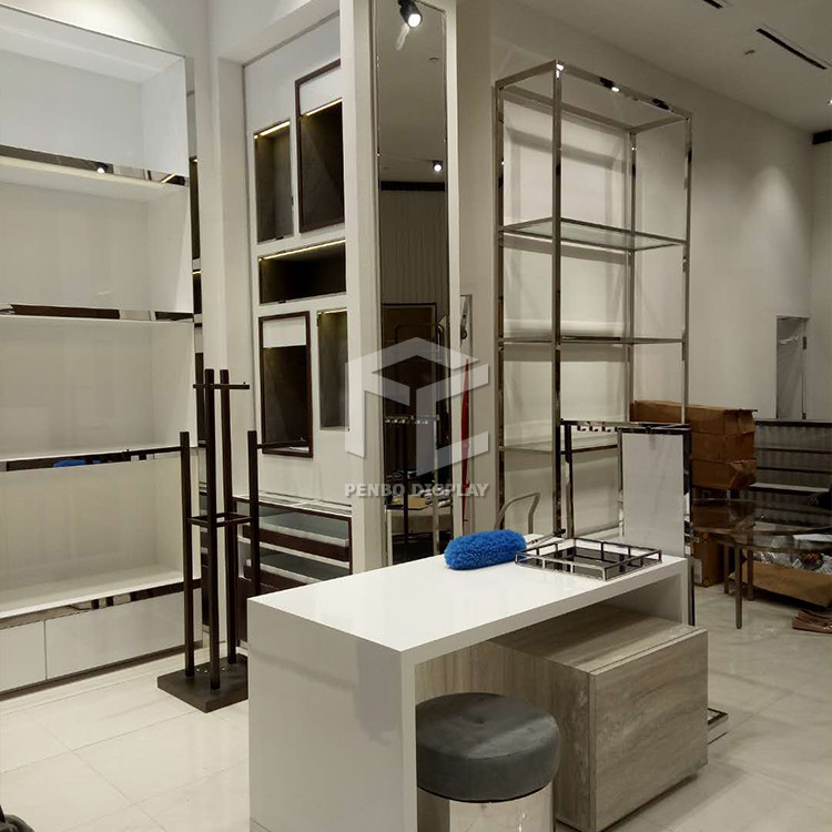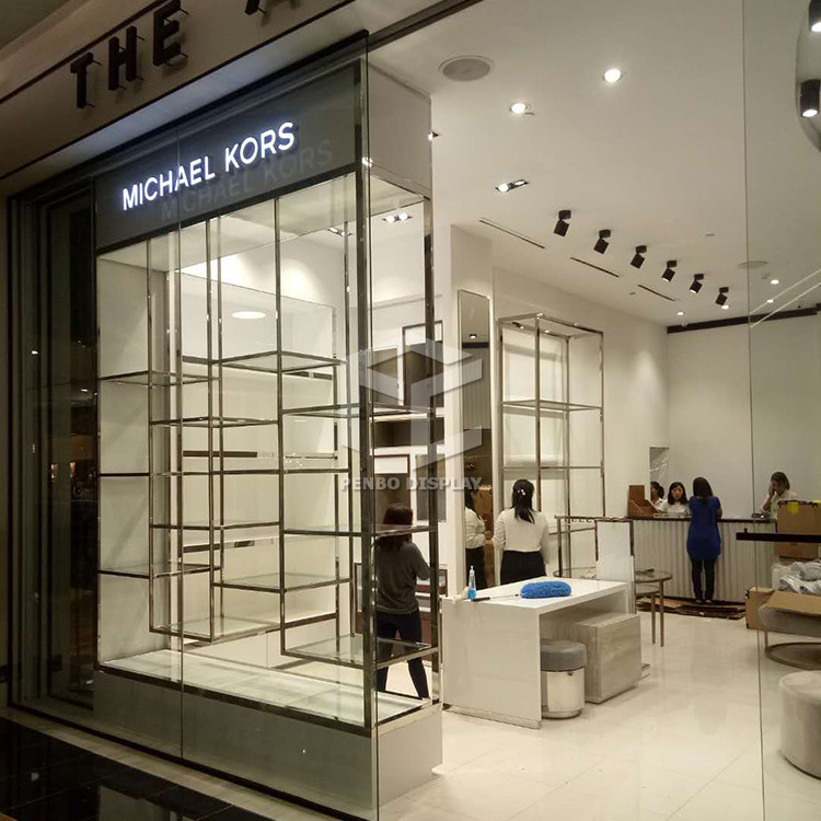 আমরা সারা বিশ্বে একটি বিখ্যাত ব্র্যান্ডের সাথে কাজ করেছি: মাইকেল কর্স। প্রধান উপকরণ হল স্টেইনলেস স্টিল এবং এমডিএফ। স্টেইনলেস স্টিল কিছু হাই এন্ড ডিসপ্লে শোকেসের জন্য বিশেষ। এমডিএফ যেকোনো রঙ আঁকতে পারে এবং যে কোন আকৃতি তৈরি করতে পারে। এটি পৌঁছানো আরও সহজ। উচ্চ শেষ চেহারা
